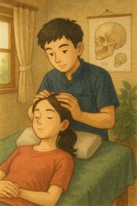 ストレスが溜まっている方には、頭のこわばりを解く施術を行います。後頭部や側頭部の調整は、全身の力みを解放する鍵になります。