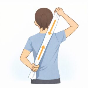 2. 息を吐きながらタオルを軽く引っ張り、背中を安定させます。