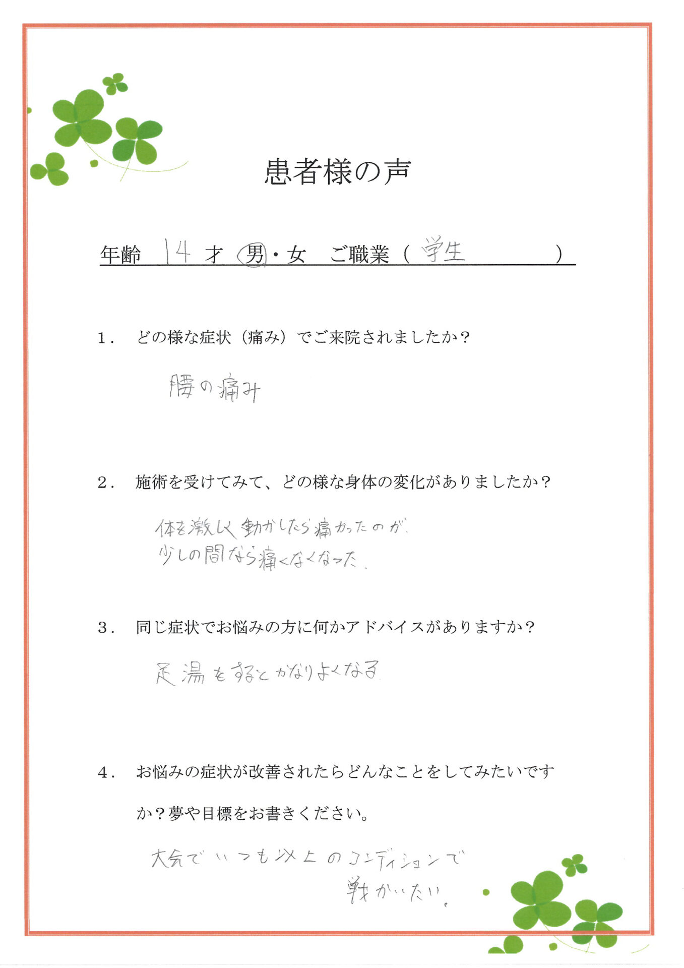 大会でこれまで以上のコンディションで戦いたいという目標、素晴らしいですね。松江市みどり整体・あおい整体グループでは、松江市で腰の痛みに悩む方のパフォーマンス向上も見据えた整体を行っています。引き続き全力でサポートいたします。