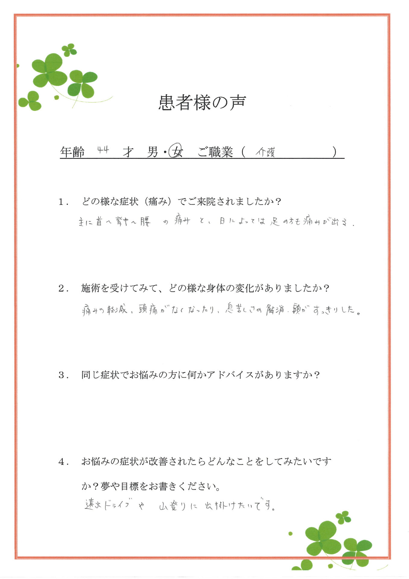 痛みの軽減、頭痛がなくなったり、息苦しさの解消、頼がすっきりした。
