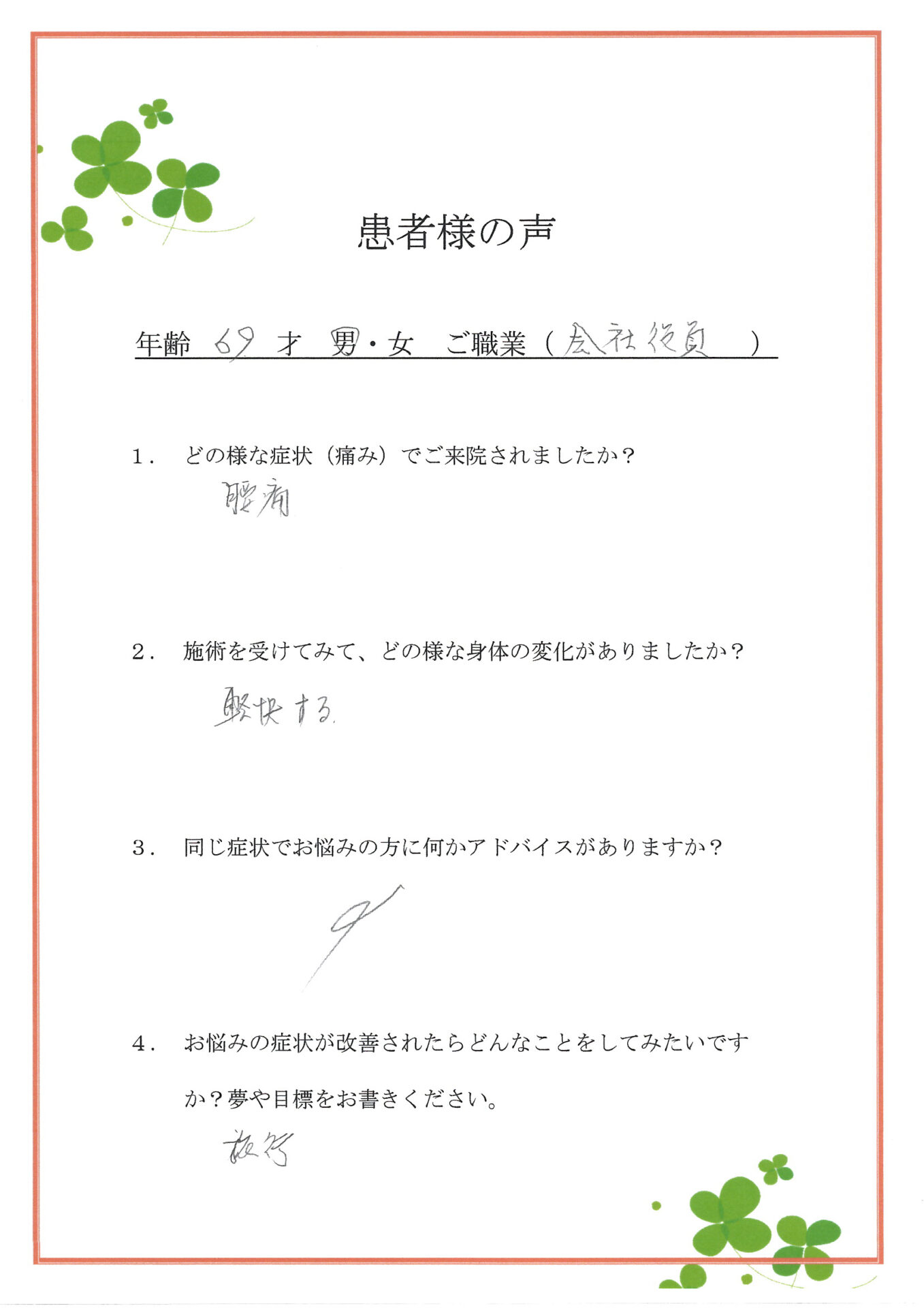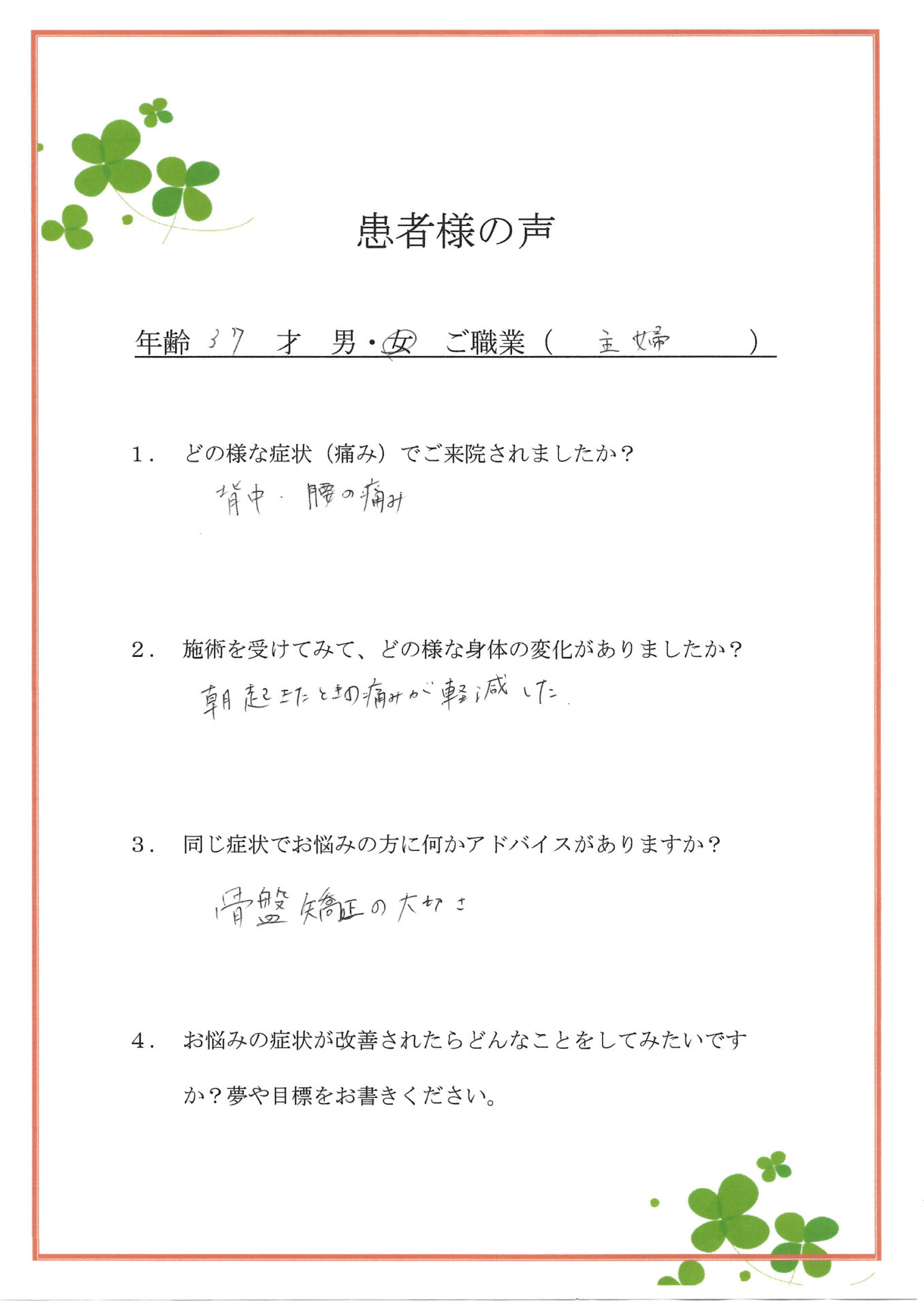 4. お悩みの症状が改善されたらどんなことをしてみたいですばってほしか? 夢や目標をお書きください。