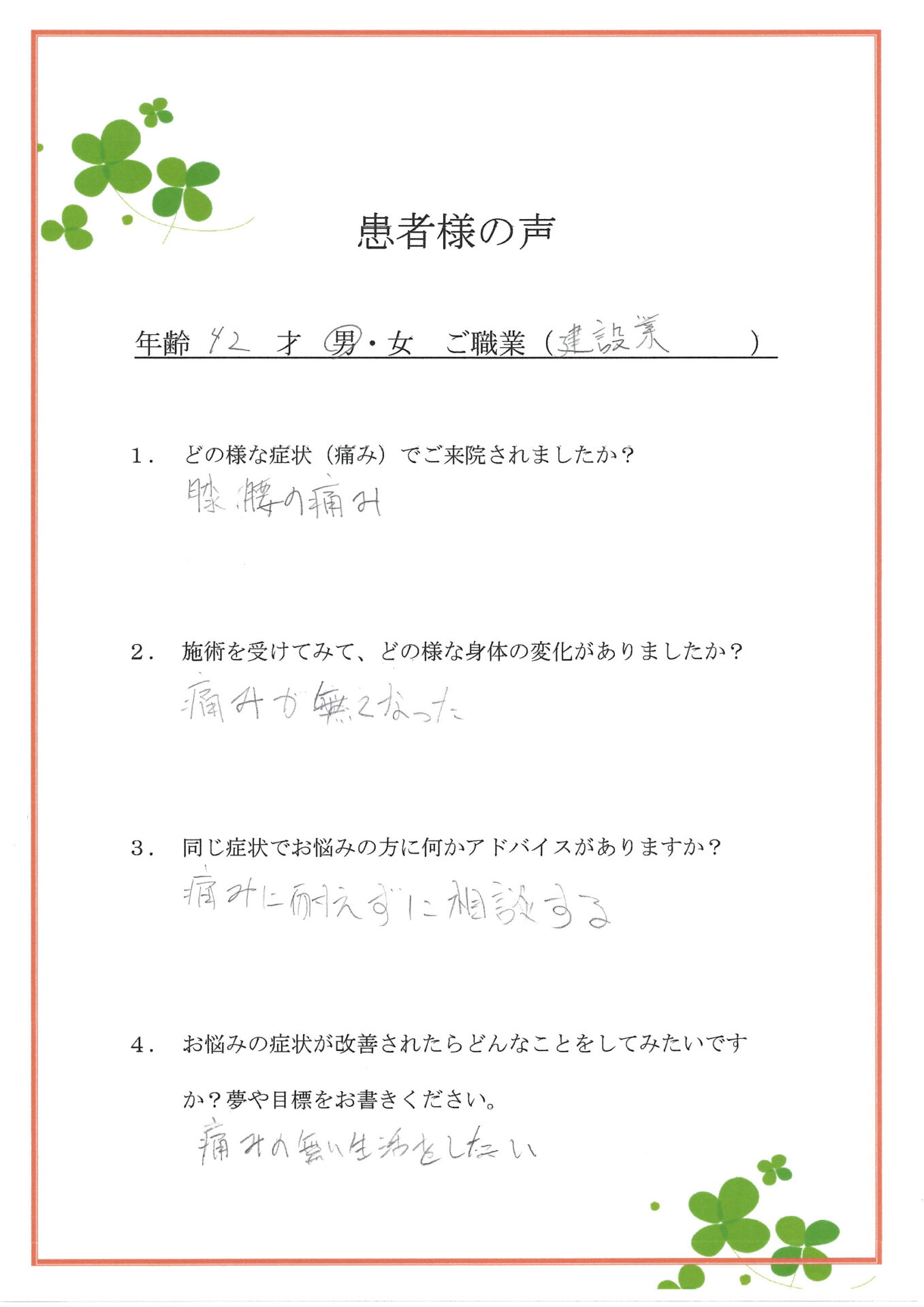 膝や腰の痛みでご来院いただきましたが、症状がなくなったとのこと、私たちも大変うれしく思っております。膝痛や腰痛は日常動作の積み重ねによって負担が蓄積しやすいため、早めに整えることが大切です。