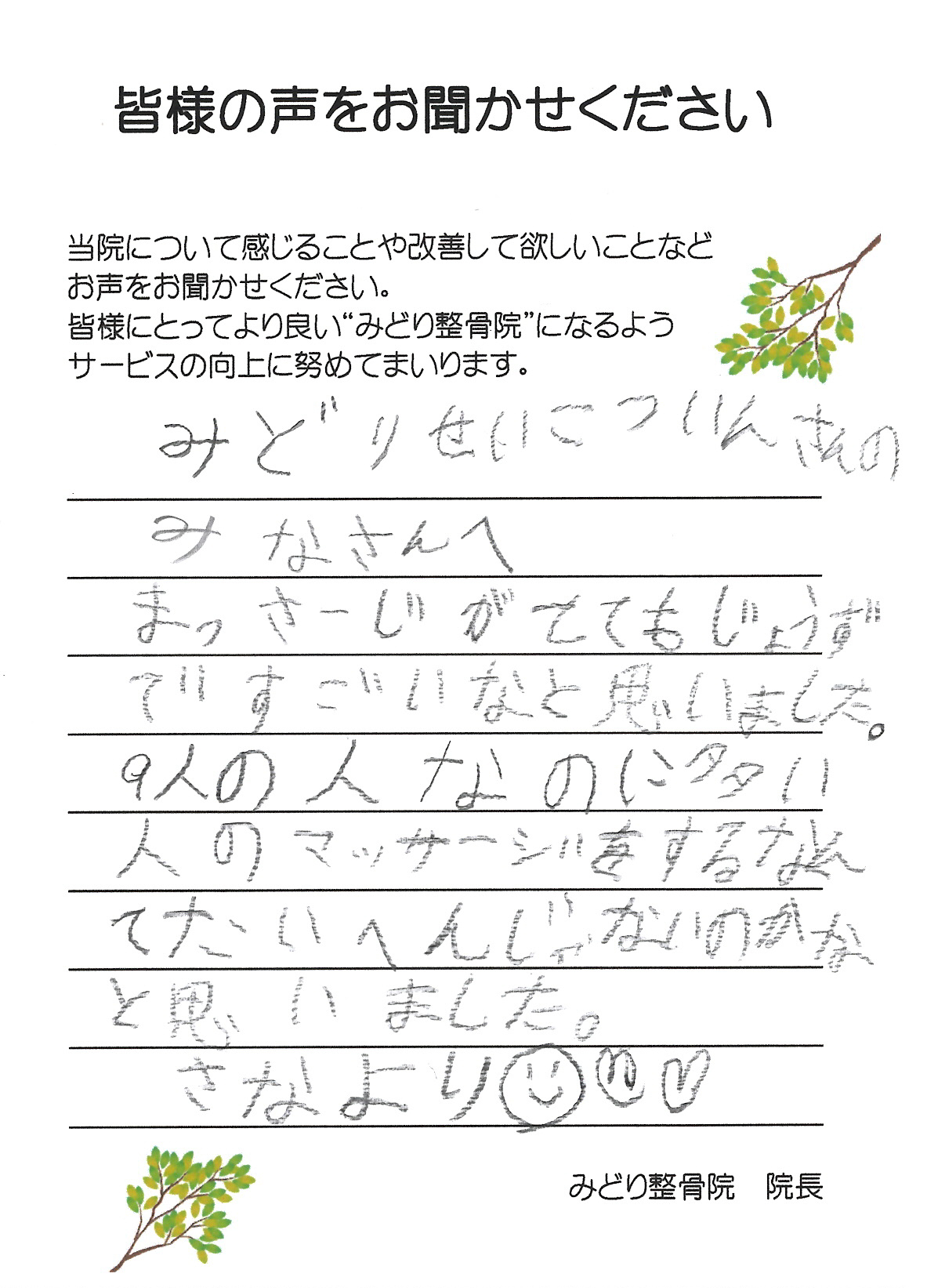「マッサージがじょうずですごい」と言ってもらえて、スタッフみんなとても嬉しく思っています。たくさんの方を施術する中でも、一人ひとりにしっかり向き合うことを大切にしていますので、そのように感じてもらえたことが何よりの励みです。