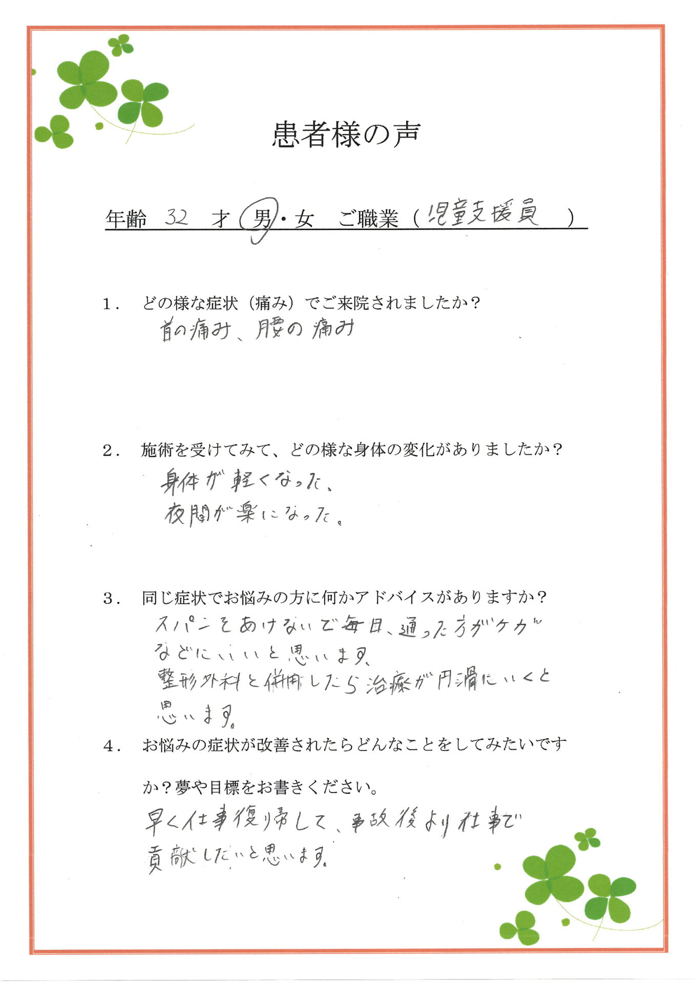 施術後、身体が軽くがり夜中、痛みで目が覚めていたのがなくなりぐっすり寝れるようになりました。