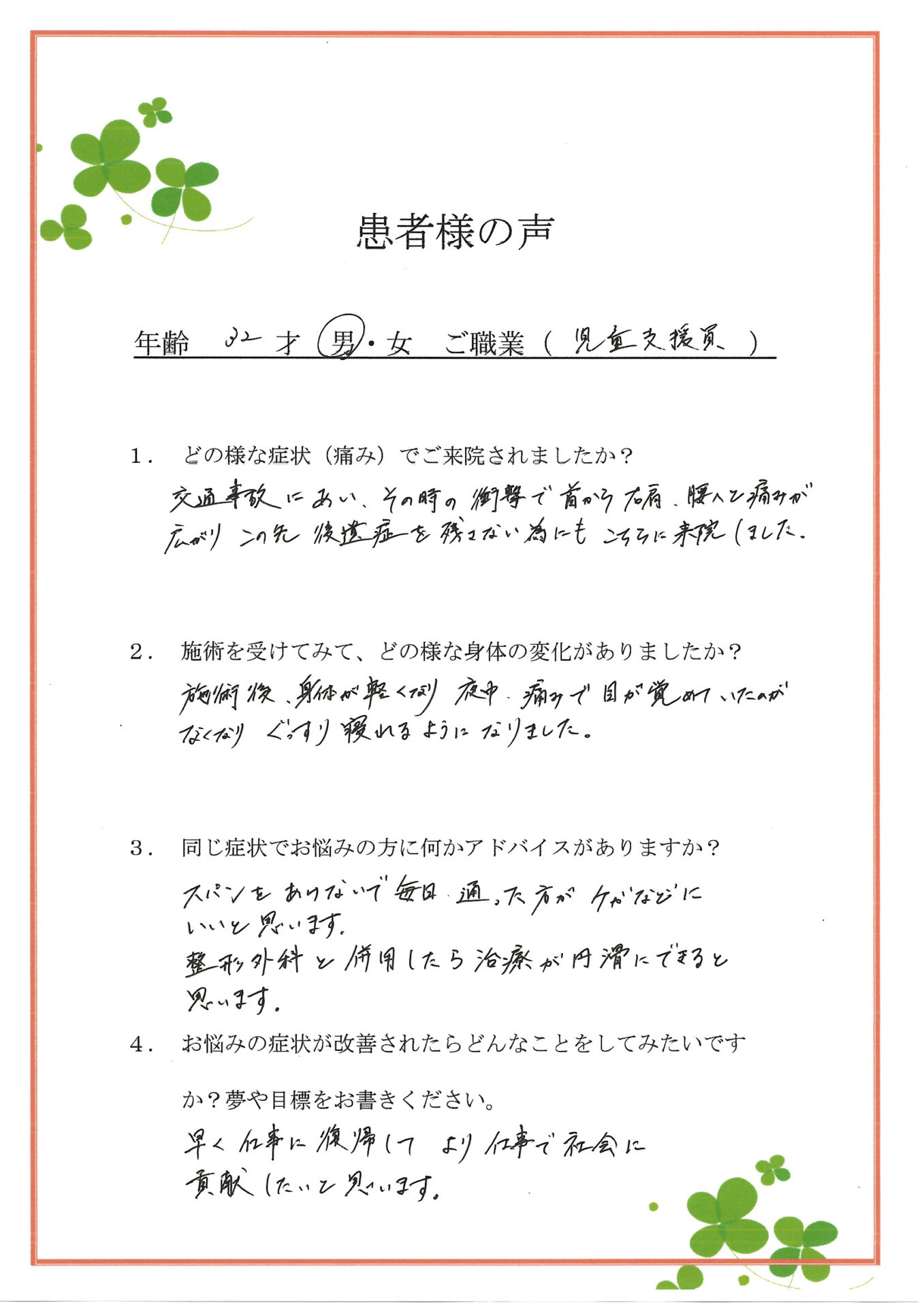 早く仕事復帰して、事故後より仕事で貢献したいと思います。