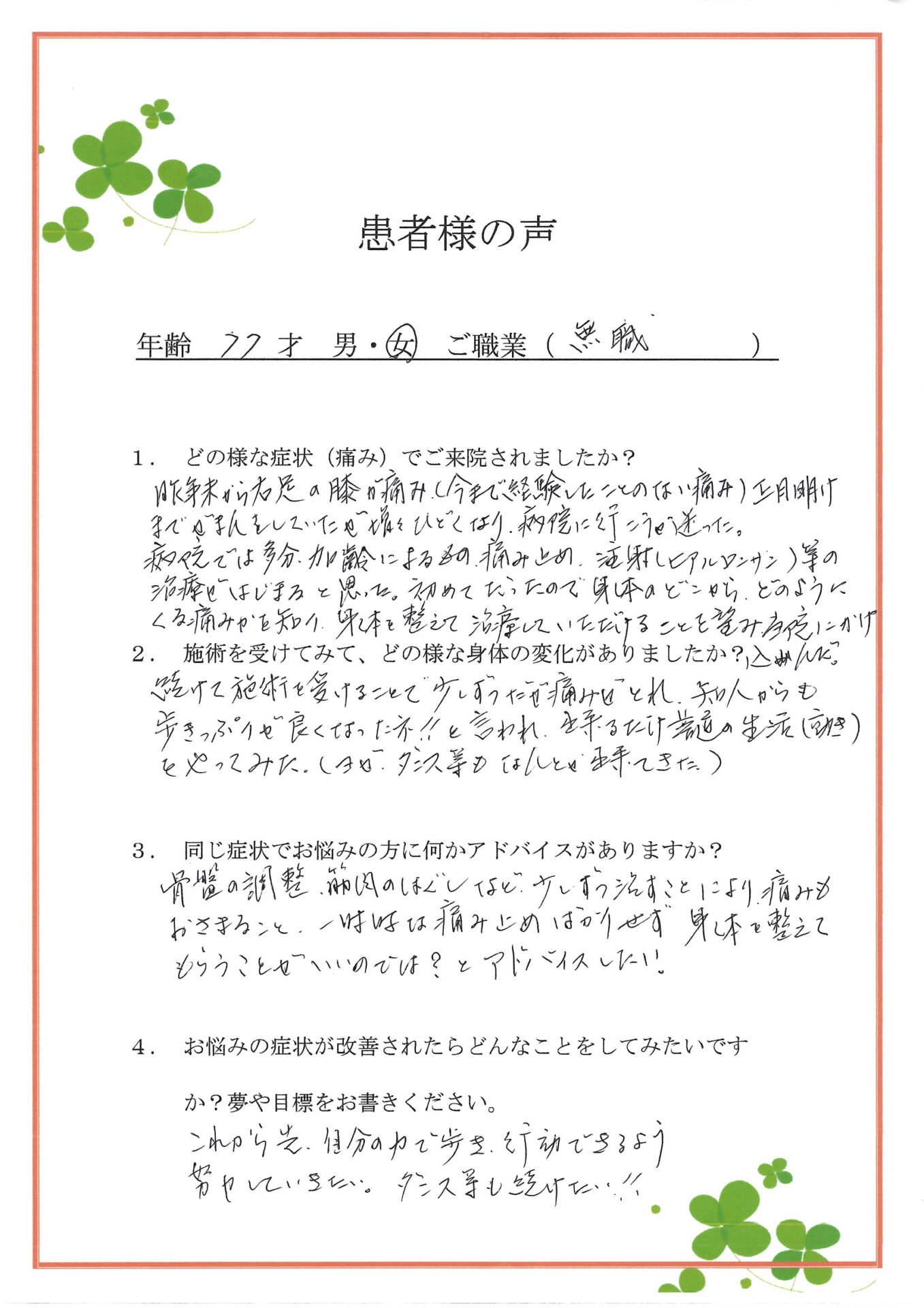 継続的な施術により少しずつ痛みが軽減し、「歩き方が良くなった」と周囲の方から言われるまで回復されたこと、本当に嬉しく思います。ヨガやダンスにも挑戦できるようになってきたことは、体のバランスが整い始めている証です。