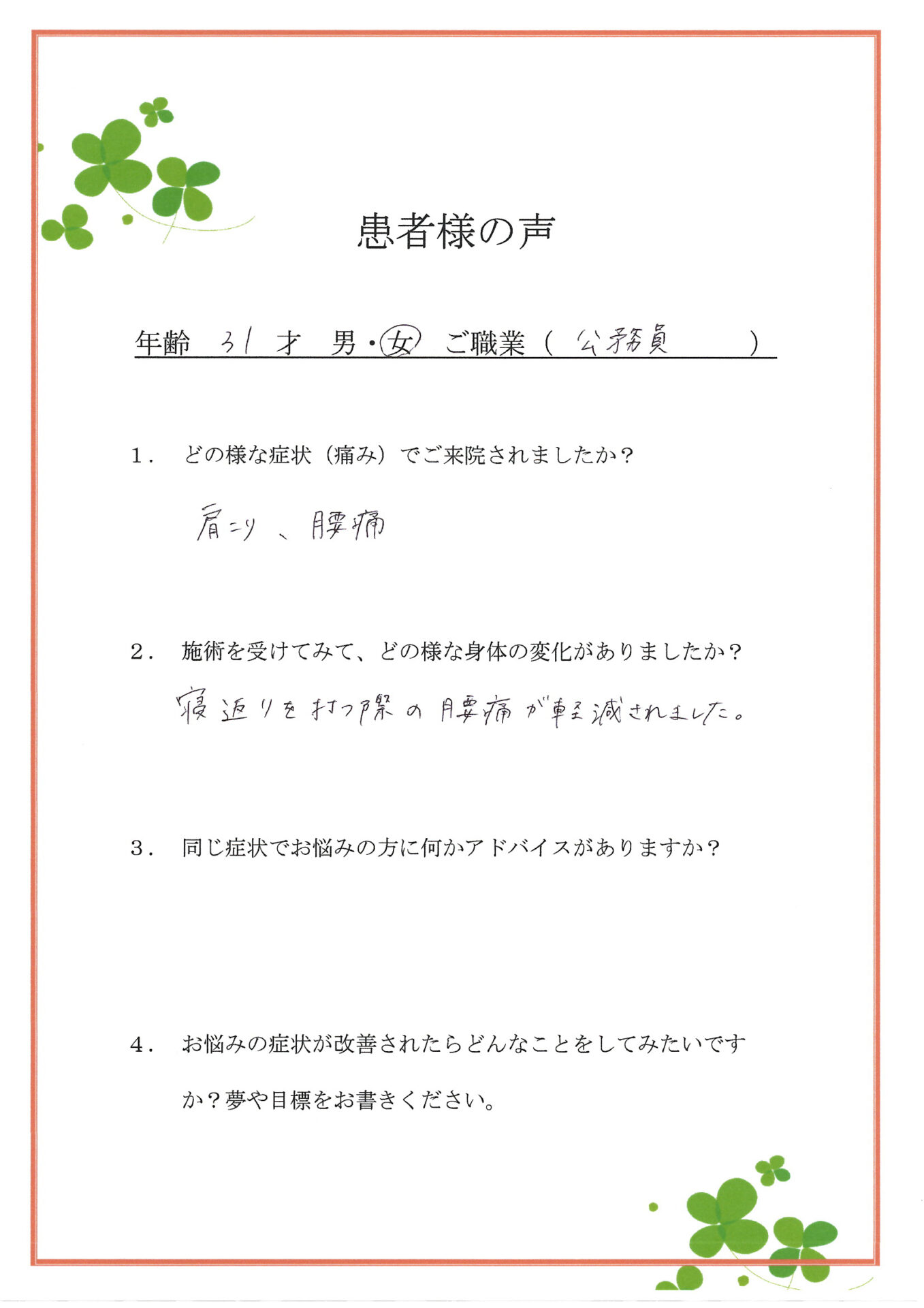 肩こりや腰痛でのご来院でしたが、寝返りの際の腰の痛みが軽減されたとのこと、大変嬉しく思います。夜間の動きが楽になることは、身体の回復力を高めるうえでも重要なポイントです。