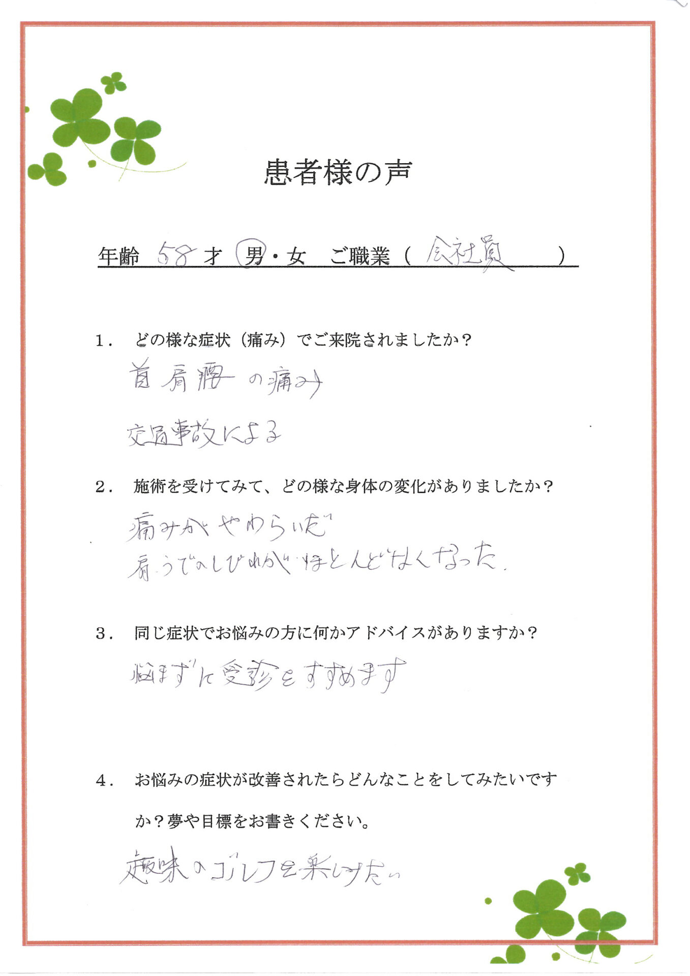 この度はご感想をお寄せいただき、誠にありがとうございます。 交通事故による肩・首・腰の痛みでのご来院でしたが、症状がやわらぎ、肩や腕のしびれもほとんど気にならなくなったとのこと、大変嬉しく思います。事故後の不調は時間が経ってから強く出ることもあり、早期のケアと継続的な施術が重要です。 「悩まずに受診をすすめたい」とのお言葉もありがとうございます。交通事故後の痛みやしびれは我慢せず、専門的なケアを受けることが回復への近道になります。 趣味のゴルフを思いきり楽しめる身体づくりを、これからも松江市みどり整体・あおい整体グループがしっかりサポートいたします。今後ともよろしくお願いいたします。