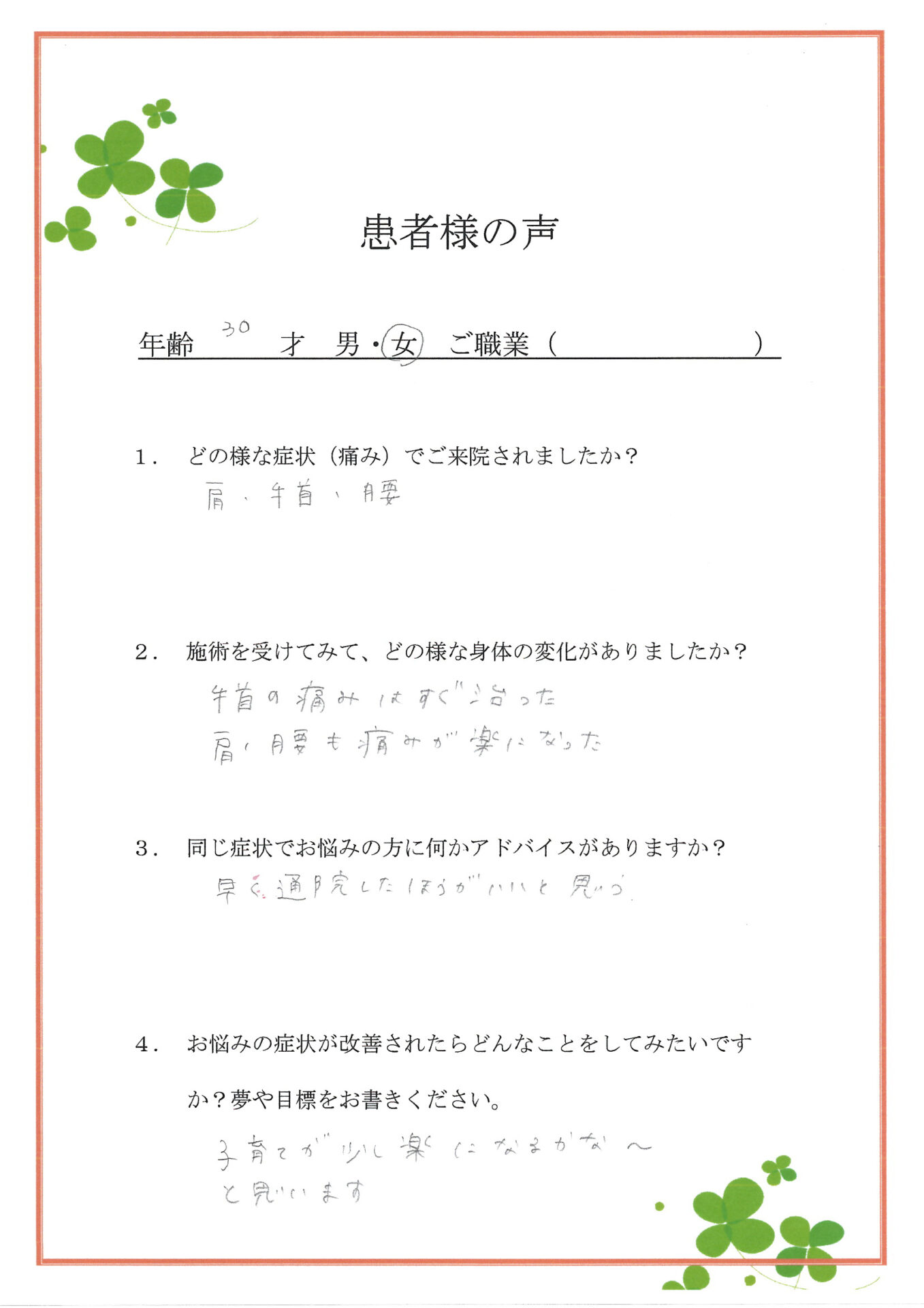 肩・手首・腰の痛みでご来院いただきましたが、特に手首の痛みが早期に改善し、肩や腰の痛みも楽になったとのこと、大変嬉しく思います。育児中は抱っこや家事などで手首や肩、腰に負担が集中しやすく、全身のバランスを整えることが回復への近道になります。